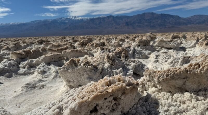 6. 배드워터 베이신 (Badwater Basin) 북미 대륙에서 가장 낮은 지점, 해수면 아래 86m에 위치한 소금 평원입니다. 끝도 없이 펼쳐진 하얀 대지는 마치 눈 내린 설원 같지만, 발에 밟히는 건 단단한 소금 결정들이죠. 이곳의 초현실적인 풍경은 데스밸리 여행의 정점이라고 할 수 있습니다.
